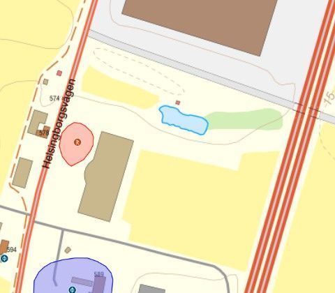 Den befintliga dagvattendammen i norra delen av planområdet är en konstgjord vattenförekomst, skapad specifikt för att samla och fördröja dagvatten. Enligt praxis omfattas helt konstgjorda vattenområden, som saknar anknytning till naturliga vattenkällor, normalt inte av strandskydd enligt 7 kap. miljöbalken. Det kan dock vara svårt att avgöra om ett vattenområde är helt konstgjort och därför bör prövningsmyndigheten utgå från att strandskydd råder och därefter gör en bedömning i det enskilda fallet.
