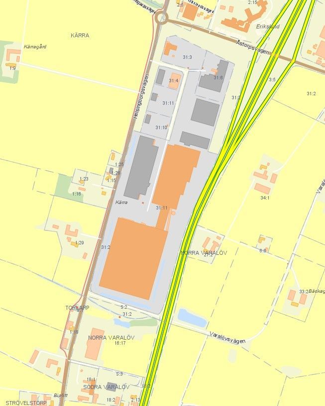 Planområdet ligger i direkt anslutning till E6 och omges av befintliga verksamhets- och logistikområden, där tung trafik redan idag är en naturlig del av trafikflödet. Detaljplanen möjliggör en ökad exploatering inom området, vilket kan innebära en viss ökning av trafikmängden. Enligt verksamhetsutövaren bedöms dock den planerade verksamheten inte medföra någon betydande ökning av trafik eller buller jämfört med dagens situation, särskilt med hänsyn till omgivningens karaktär och befintliga verksamheter. I bilden till höger syns aktuell fastighet i söder i förhållande till befintliga verksamheter, samt närheten till motorvägen i öst.