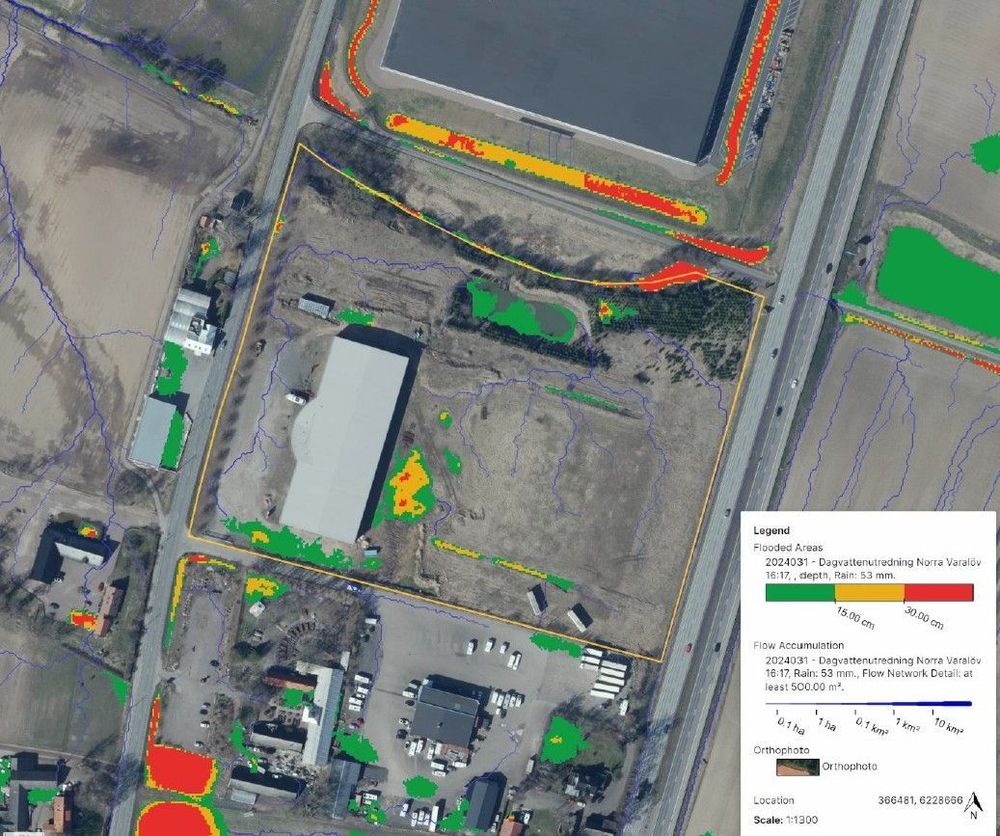 En översiktlig lågpunktsanalys har utförts med hjälp av ScalGo Live för att erhålla en uppfattning om var det finns risk att vatten kan bli stående vid kraftiga regn. I bilden presenteras vattendjup i lågpunkter vid en regnvolym motsvarande ett 100-årsregn med 60 minuters varaktighet och klimatfaktor 1,25.