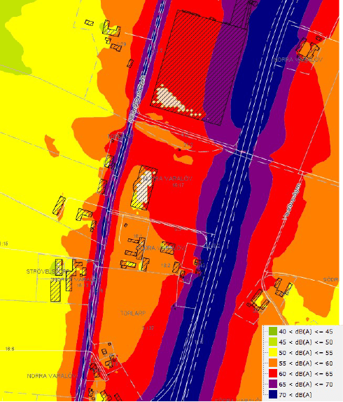 Ingen ny bullerutredning har genomförts inom ramen för detaljplaneprocessen. Enligt uppgifter från verksamhetsutövaren bedöms den planerade utökningen av verksamheten inte ge upphov till en ökad trafik eller ljudalstring som medför att riktvärden för buller överskrids vid närliggande bostäder. Bedömningen grundar sig på verksamhetens karaktär och trafikvolym i förhållande till det omgivande området, som redan idag präglas av tung trafik på Helsingborgsvägen och närheten till E6. Nedan syns en översiktlig bild av dagens bullernivåer som är starkt påverkade av befintliga vägar. Detaljplanens ringa ökning av trafik bedöms inte bidra till en ökad bullersituation.